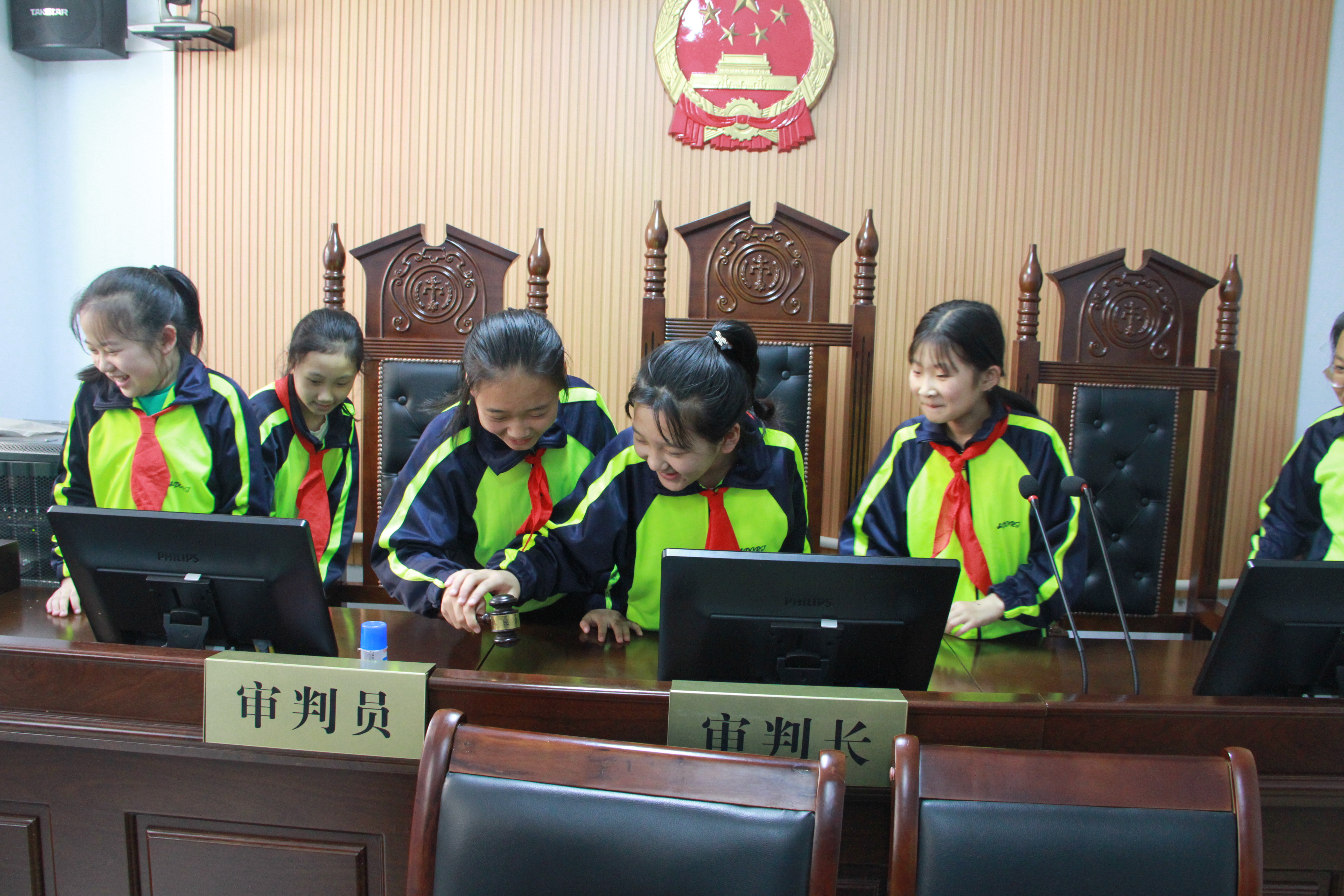 “原来法庭是这个样子的呀!”“我也要当一回法官!”在审判法庭,他们兴奋地走上审判台,敲响法槌,体验着当法官的感觉,感受法庭审判的神圣与庄严。每到一个参观场所,好奇心和求知欲都让同学们赞叹不已。